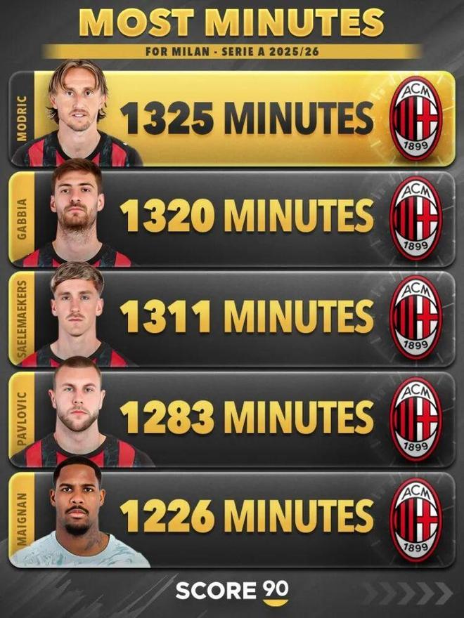 Score90统计了米兰球员本赛季意甲出场时间,并列出榜单,40岁莫德里奇1325分钟居首,他仅有25分钟未在场上。